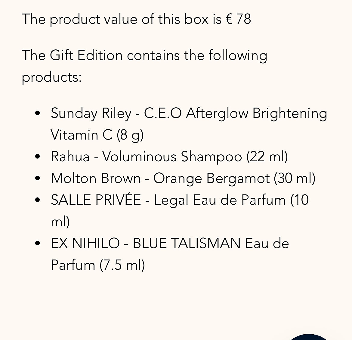 А в боксе за 25€ наполнение на 80€ , по европейским ценам. У нас одна тревелка Ex Nihilo блю талисман дороже 25€ стоит , без остального и подарков.