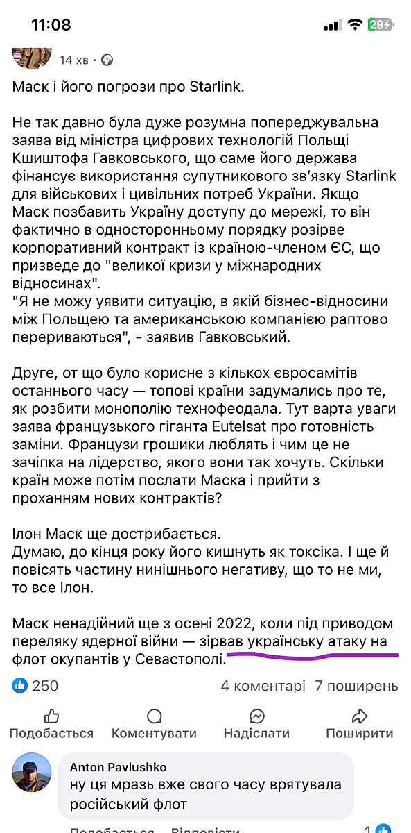 ’Я буквально вызвал Путина на поединок из-за Украины, а моя система Starlink является основой украинской армии. Вся их передовая линия рухнула бы, если бы я её отключил.