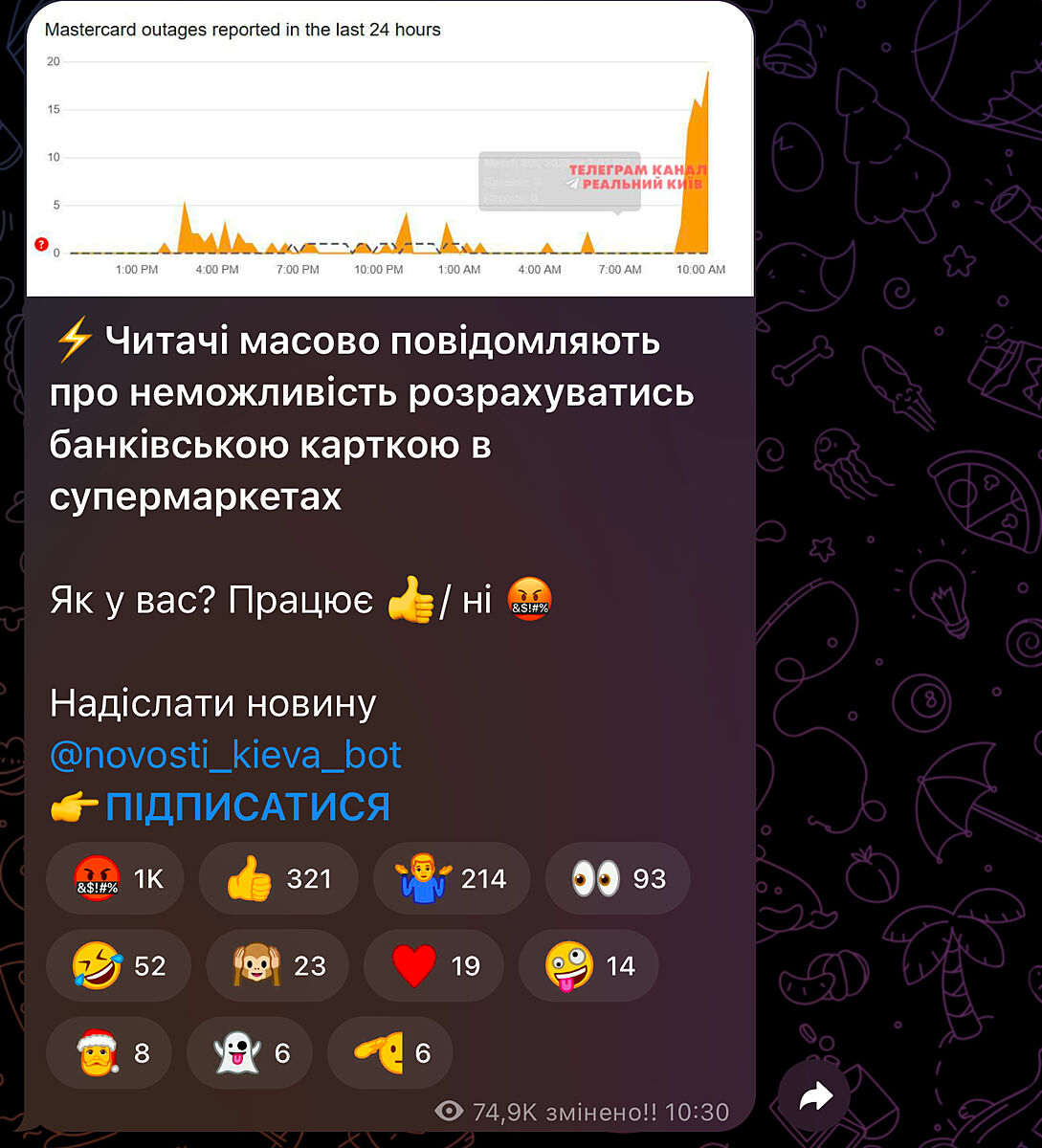 Паблики пишут, что в Киеве и в других городах Украины невозможно рассчитаться картой в супермаркетах.