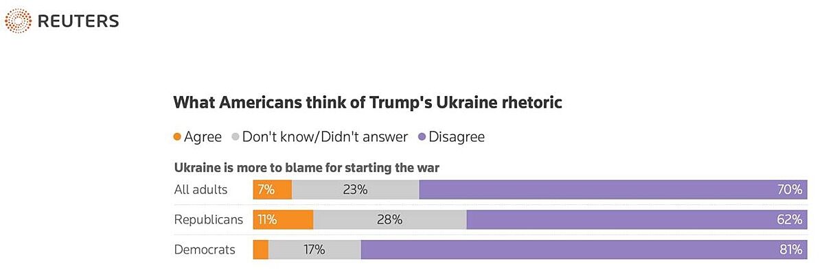 Нещодавно, згідно з опитуванням CNN, 78 відсотків підтримали б мирну угоду між Росією та Україною. Тому в США яскраво виражене бажання швидкого миру в Європі. Однак у цьому опитуванні не ставилося запитання, чи може це також бути мирна угода між Трампом і Путіним через голови українців.