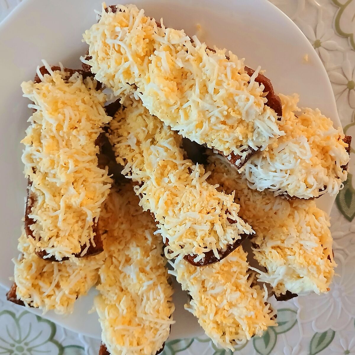 Мне 47, тоже никогда так не делали, гренки со шпротами и помидором/огурцом, а плавленый сыр с чесноком и майонезом без яйца, отдельное блюдо, либо просто на хлеб намазывали, либо вприкуску с чем то ели. Сейчас так тоже делаем иногда.