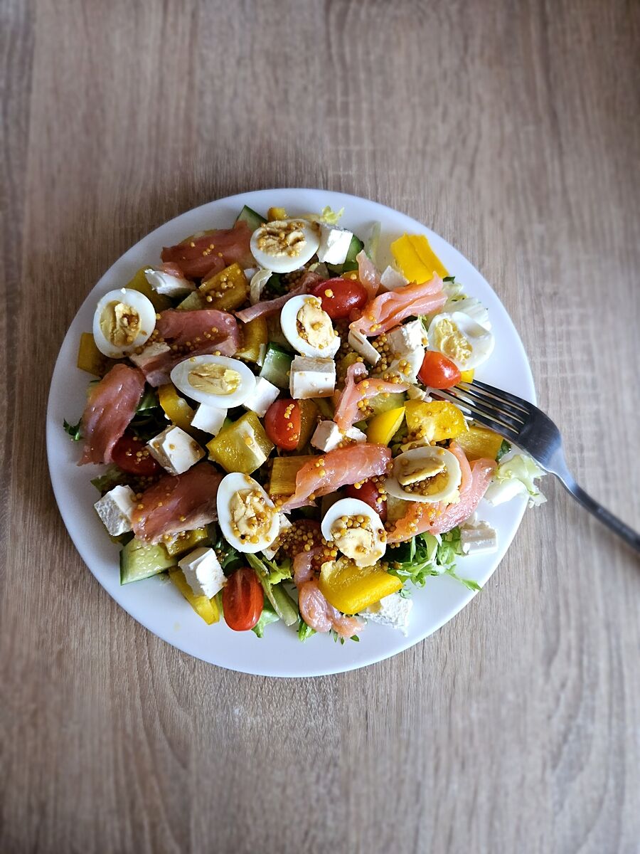 Мікс салату, огірок, болгарський перець, помідори чері, сир фета, яйца перепелині, червона рибка ( заміняю на тунець, курку,і ндичку, креветки) заправка ( соєвий соус, мед, сік лимону, оливкова олія та французька гірчиця)