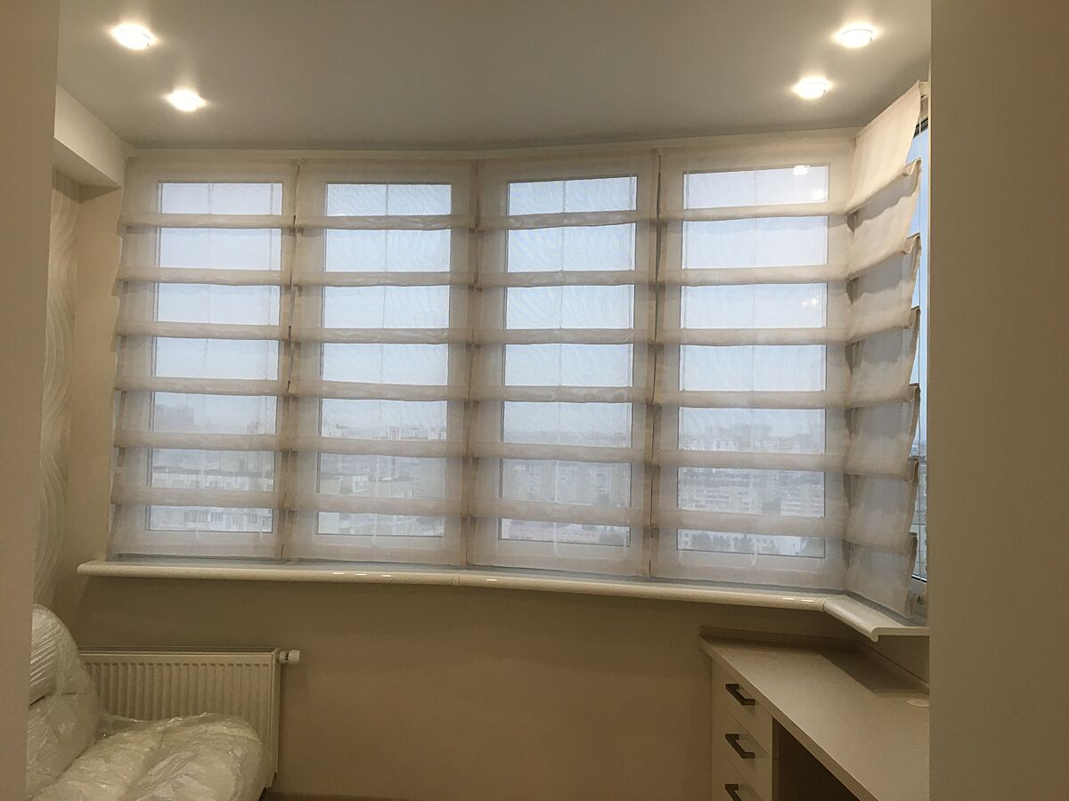 У мене прозорі, але можна зробити з будь якої тканини. Для того, щоб не шуміли, можна внизу поставити таку фіговину, на яку будуть вони прикріплюватися (я не знаю, як вона називається, але мені пропонували, я відмовилась).
