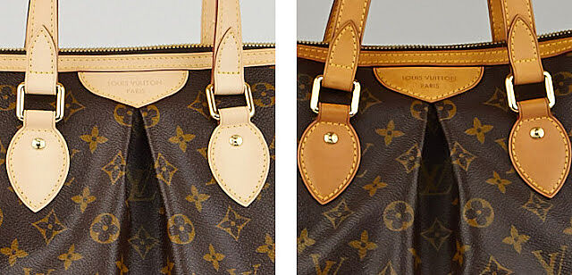 У меня 2 сумки. Одна из кожи, другая с монограммой. Ручки у сумок с монограм, сделаны из необработанной телячей кожи, пока кожа не загорит ( не появится патина), ручки нельзя мочить и жирными руками трогать нельзя.