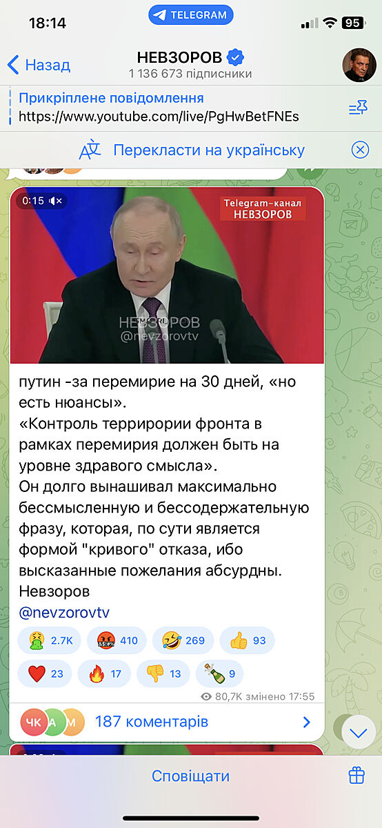 По словам Путина, Россия поддерживает "саму идею закончить конфликт мирно" и он не исключает, что обсудит перемирие с американским президентом Дональдом Трампом. При этом Москва требует гарантий, что во время перемирия Украина не будет проводить мобилизацию и подготовку военнослужащих, а также получать оружие от союзников: