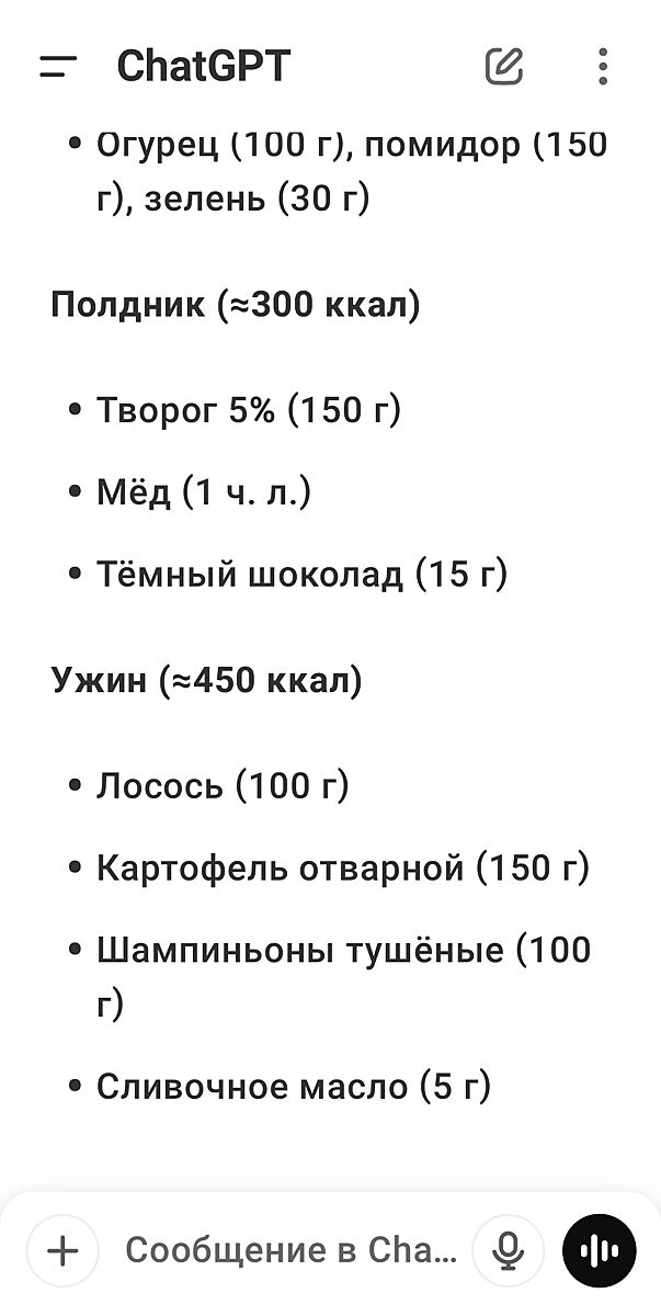 Как по мне, то полдник и перекус там лишний. Я начала поправляться последнее время, но думаю ,что причина в гормонах, мне 49. Для интереса спросила у GPT чата, сколько калорий мне нужно в сутки, была удивлена,что 1600-1800 и это для меня реально много. Решила заставить себя спортом заниматься