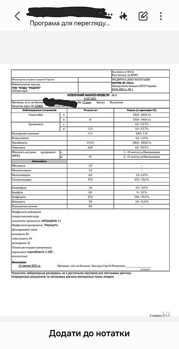 Ось такий був аналіз. Капали еритроцитарну масу. Підняли гемоглобін до 70 з чимось кров´ю, потім вже препарати заліза. Піднявся до 90, якщо я правильно пам´ятаю. Якщо що, то свекруха і зараз жива) це не був рак, вона обстежувалась.