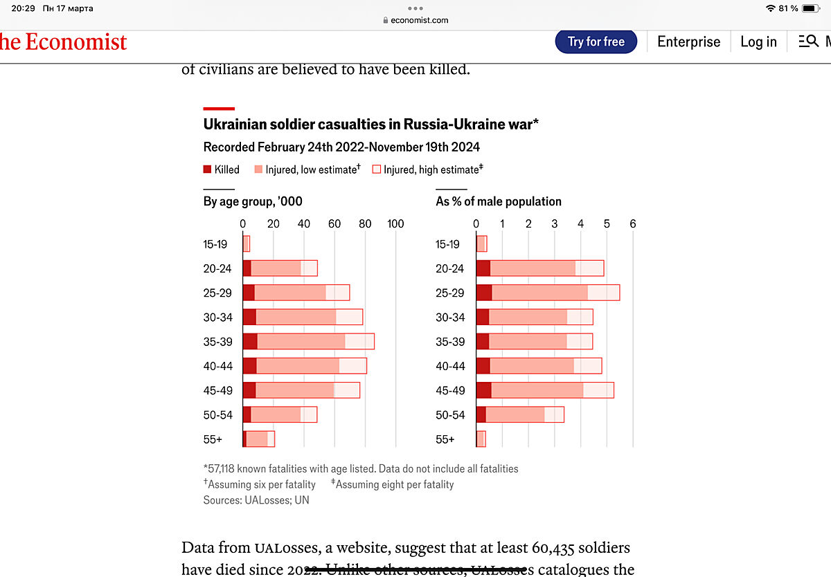 «Данные веб-сайта ualosses показывают, что с 2022 года погибло не менее 60 435 солдат. В отличие от других источников, ualosses каталогизирует имена и возраст погибших, что позволяет подсчитать потери по возрастным группам и в процентах от мужского населения. (Хотя на передовой служат некоторые женщины, подавляющее большинство бойцов — мужчины.)