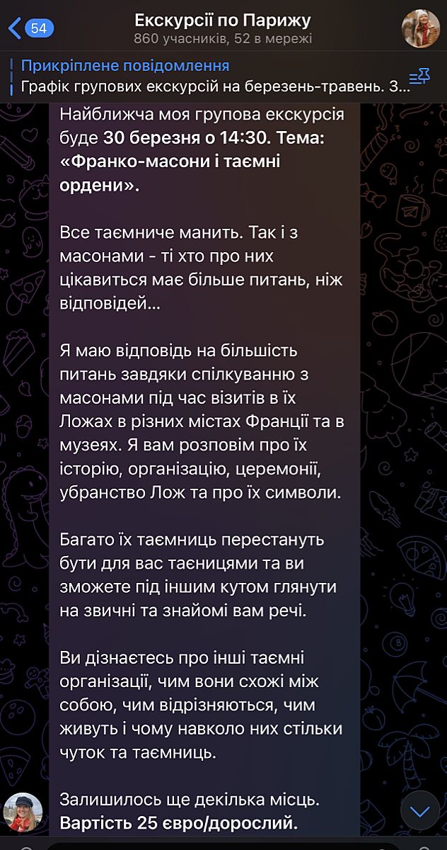 Напишіть мені. Моя колега виїхала й проводить екскурсії українською мовою в Парижі.