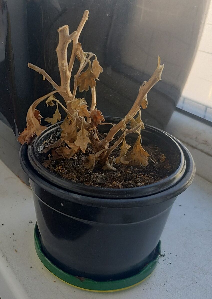 Я, наприклад, повний рукожоп у вирощуванні пеларгоній і вони зазвичай помирають, але зараз на весняному сонці в мене навіть безнадійні засохлі пеларгонії почали пускати паростки. А зимували в холодній кладовці і теж виглядали сумно, майже як у вас на фото. Тобто я теж погоджуюся, що жива хризантема вже б прокинулася.