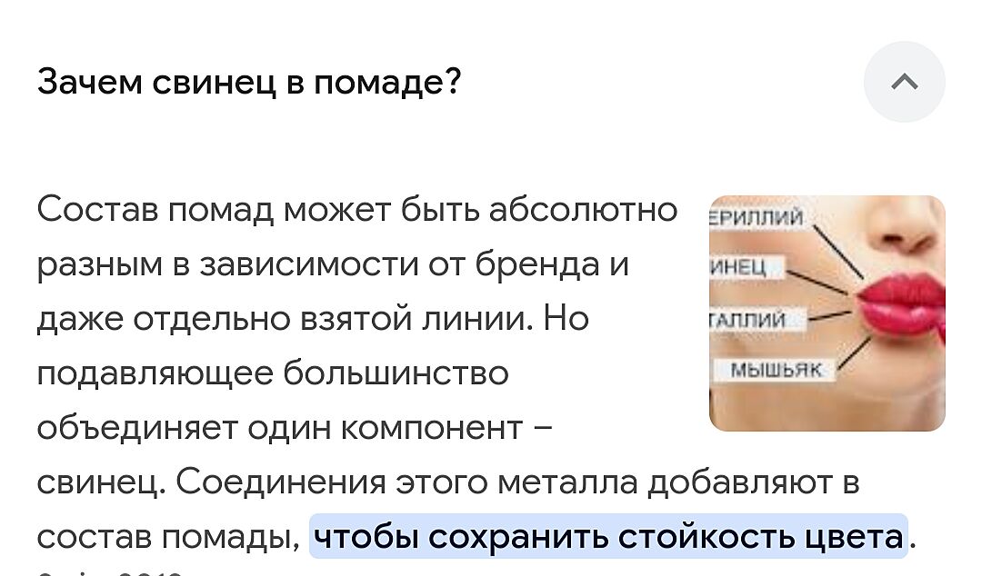 Сравнение у вас субъективное. Есть куча других средств, которые могут иметь в составе вещества вредные и даже не раскрыты, но все равно в том количестве в котором они содержаться не смертельно опасно. Вы же не будете жрать эти помады по целой штуке каждый день. Возможно у вас окр , то тогда я вас понимаю , сама страдаю этим , но в другой форме