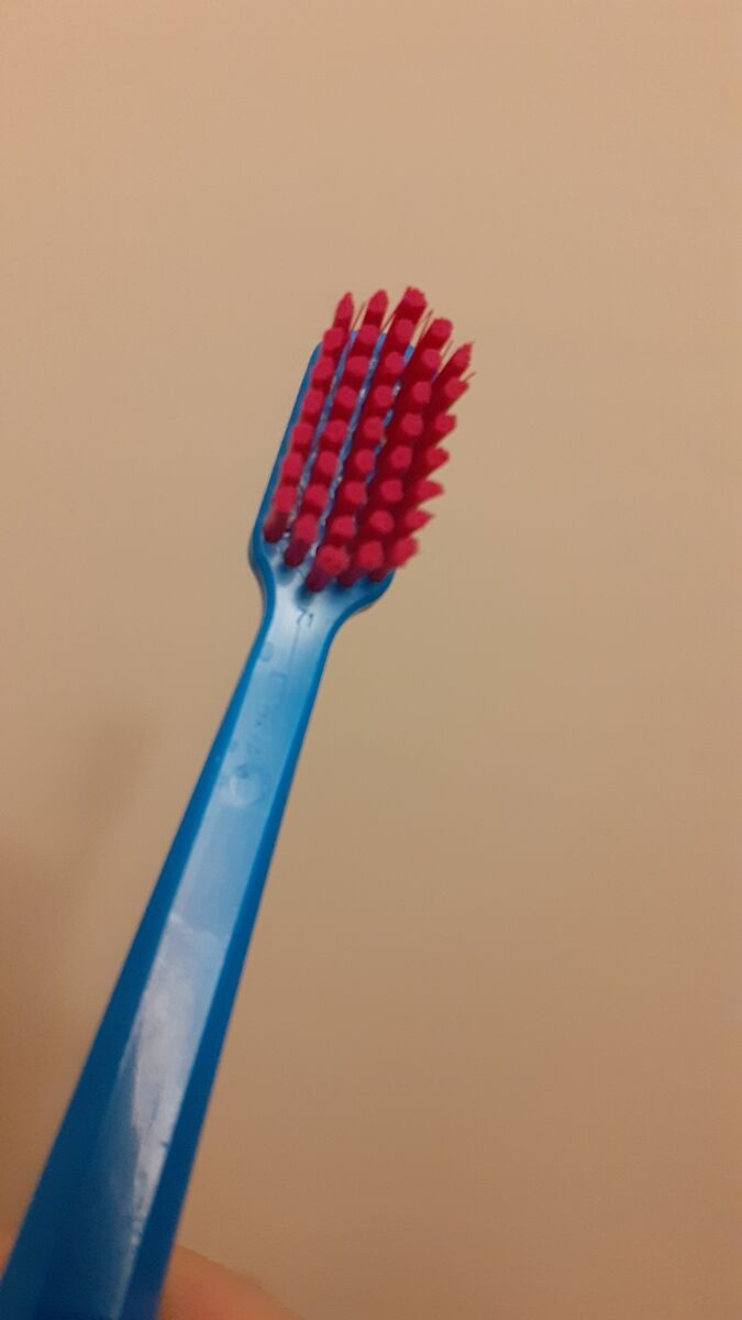 Она имеет маленькую головку, которая качественней вычищает в отличии от большой, имеет ровную, плотную, мягкую щетину, которая не травмирует десна. Если сравнивать жесткость щетины курапрокс и других мягких щеток, то курапрокс значительно мягче, благодаря этому и нет кровоточивости.