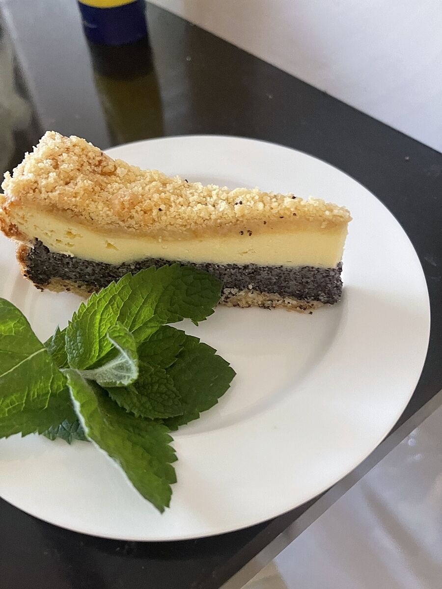 Я на око роблю і придумала сама , але це дуже смачно. Мак мелений залити гарячим молоком + 2 ст ложки манки + цукор за бажанням . 5 хв варити щоб загусло . Сир + 2 яйця , 2 ст ложки сметани , 2 ст ложки кукурудзяного крохмалу .цукор Яблука потушила 5 хв , добавила пакетик кисіля ( був клубнічний ) тому вони рожеві на фото . У духовці пекти 50 хв