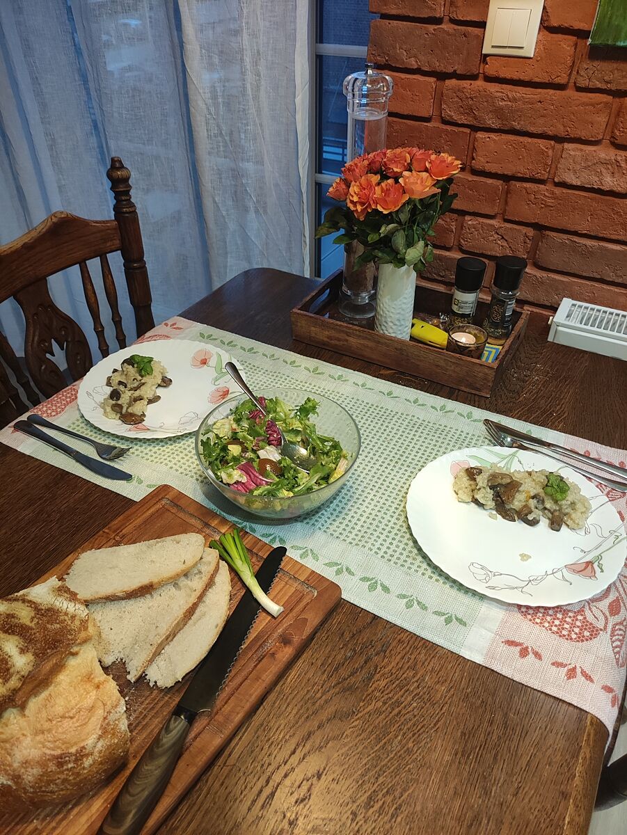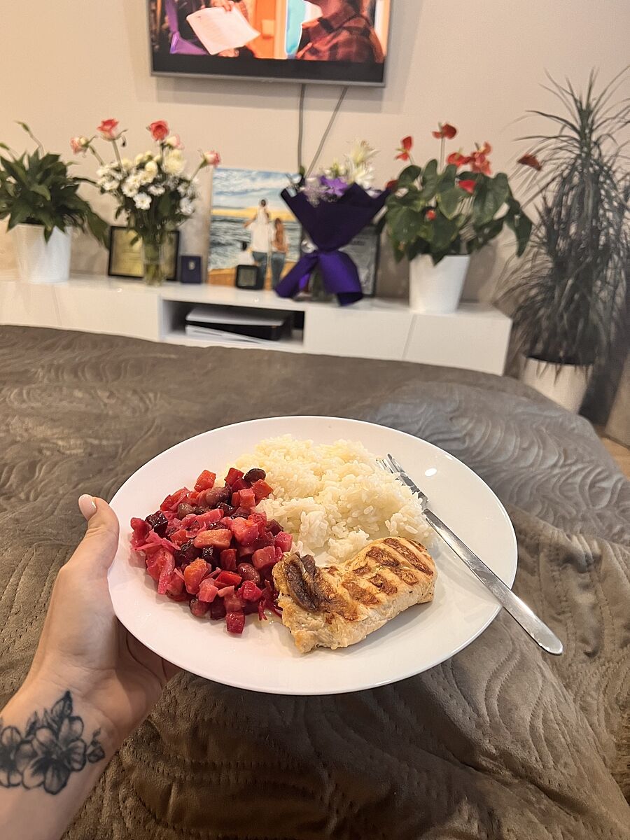 Меня больше смущает винегрет и рис в одной тарелке. Винегрет это ж не тот салат, что б к нему ещё и рис добавлять, достаточно просто что то белковое добавить.