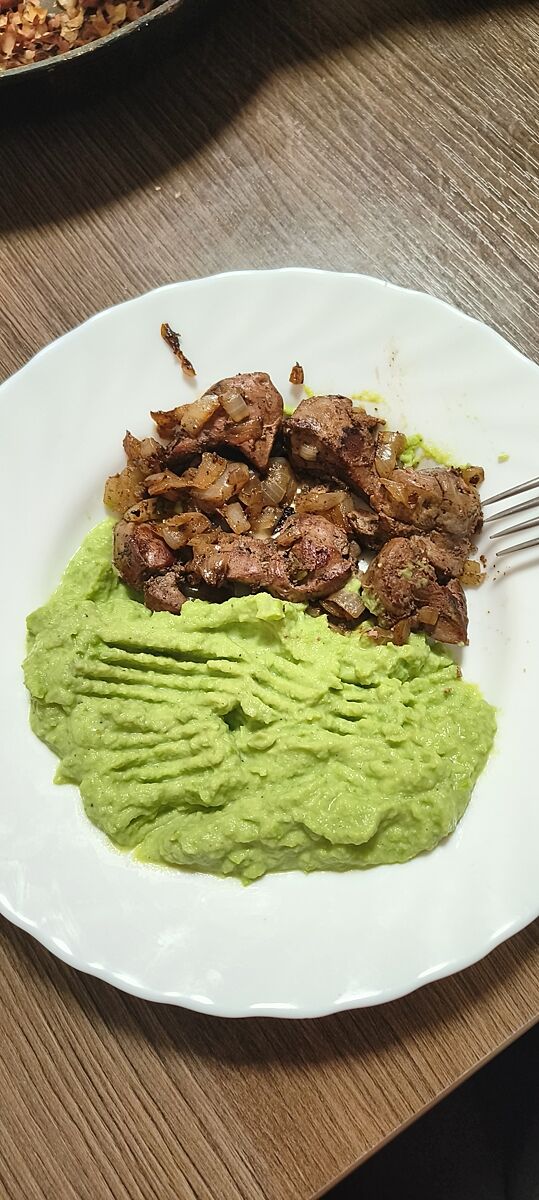 Я на марафоне, 1500 ккал в день. Сегодня пюре из горошка и цв.капусты со сливками и печень куриная.