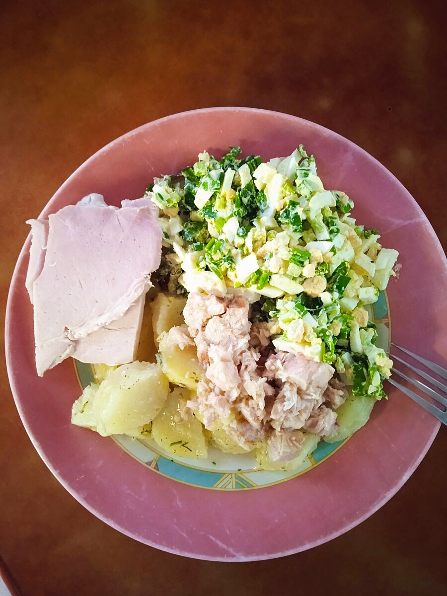 Пару часов назад был борщ, потом запеканки кес с зелёным чаем. Скоро буду минтай запекать и кашу разогрею, + салат из свежих овощей (капуста, редиска, огурец, зелень).
