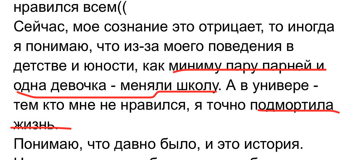 Парадокс правда? Писати в темі спочатку, що діти змінювали школу і що псувала життя в універі. А потім такі коментарі, що нічого особливого не робила. Автор пояснює це тим, що її свідомість заперечує те, що вона булила інших