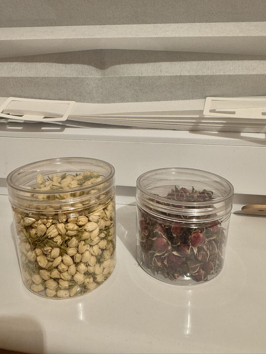 На фото две банки с чаем: жасминовый (слева) и розовые бутоны (справа). Это популярные цветочные чаи, которые обычно считаются качественными, если имеют насыщенный аромат и чистый, цельный вид без посторонних примесей.