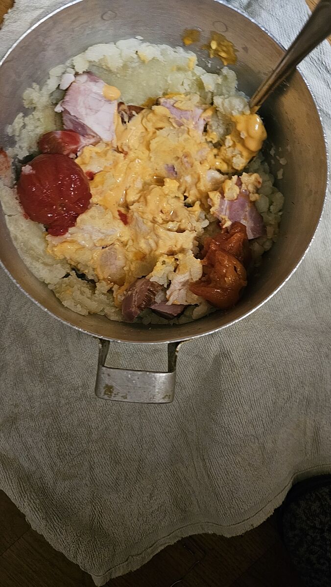 Молодая картошка варенная пюрешка, кусочки куринной грудки,кусочки грудинки,соус торчин и 2 квашенных помидорки