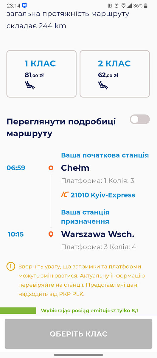 До потяга, який приїжджає в 5.44 до Хелму підвязаний інтерсіті Хелм-Варшава, що відправляється в 6,59 - це видно у додатку (скрін).