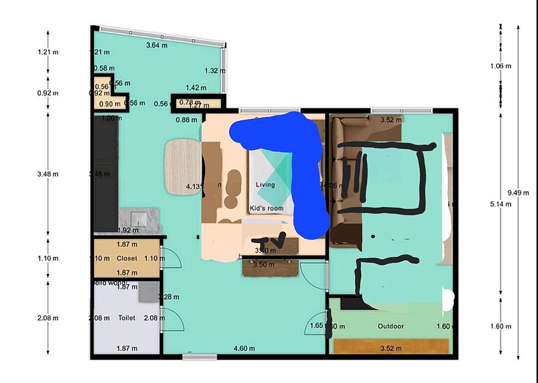 А чого зону дивану не зробити в кімнаті біля кухні, а спальню у дальній кімнаті? Це як би логічніше. Можна і оупенспейс з кухнею