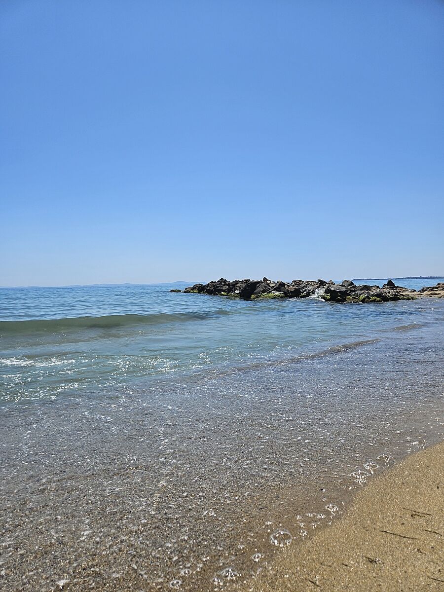 Мне нравятся Приморско городок, молодежный. Белый песочек. Медуз не встречали. Людей в прошлом году было меньше обычного, все местные в Грецию ломанулись, сезон был не очень. Сейчас так на море.