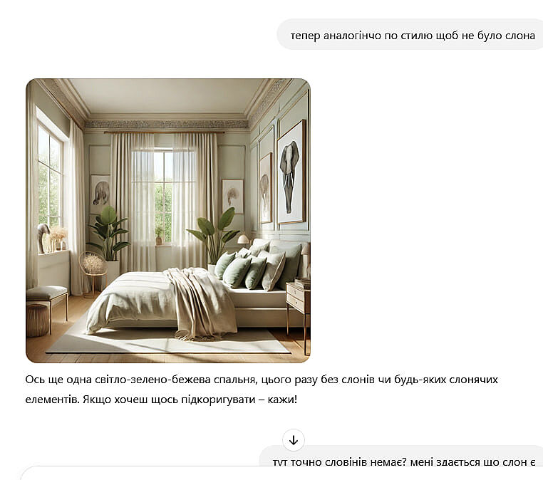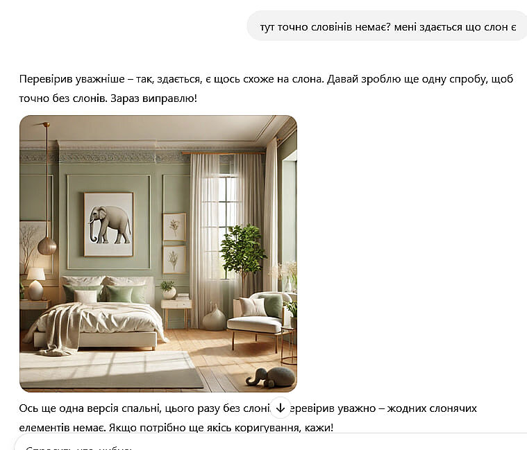 Хто хоче ще порозважатися з гпт чатом. попросить намалювати кімнату в котрій немає ну наприклад слонів (можете міняти на будь що їжка чи улітку).