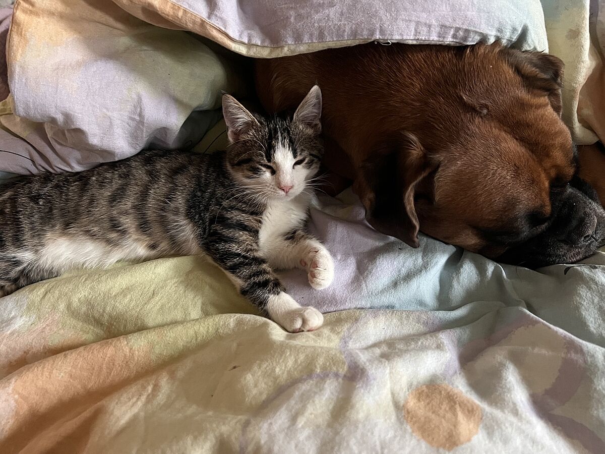 Котенок вырос с собакой, специально такого брала. Поэтому не боялась. Собака тоже жила всегда с котом.