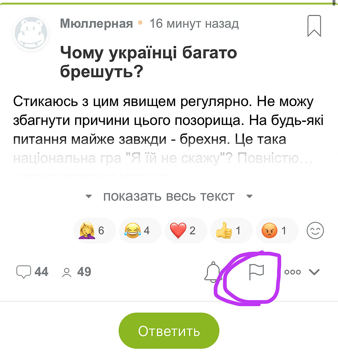 Обвела вам фиолетовым - нажимаете на флажок - и коротко описываете текст, смысл вашої скарги. Я вже зробила. І ви зробіть