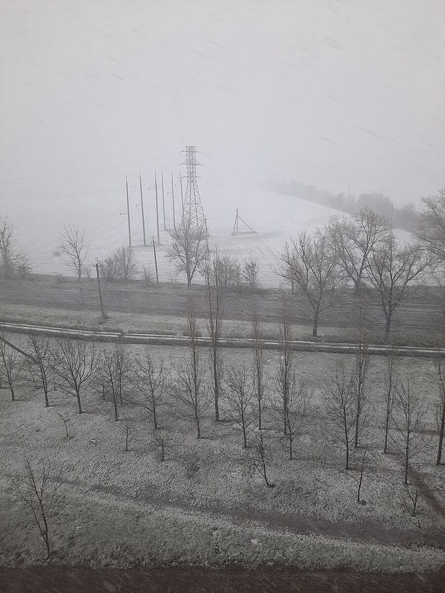 У нас тоже всю ночь дождь падал. А это глядь в окно - а там білий сніг на зеленому листі.
