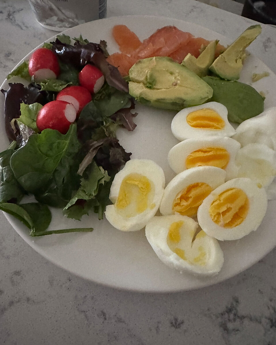 Разве это еда? У меня был завтрак 2 отварных яйца, большая порция салата с оливковым маслом, тост с творожным сыром и кусочком буженины и кофе с молоком.