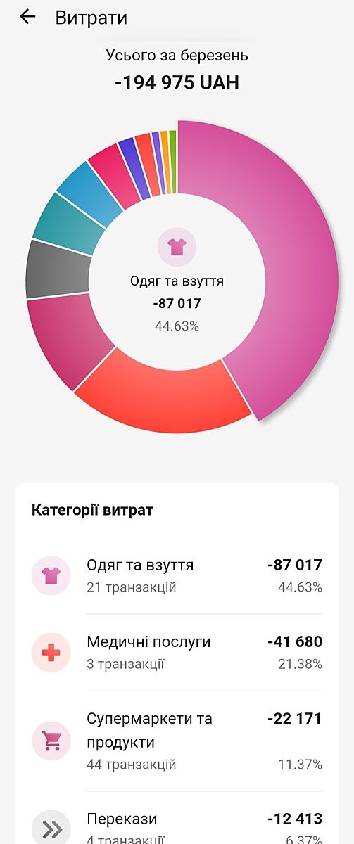Ну вот аналитика за апрель, налом я почти не пользуюсь. На категорию ’одяг та взуття’ можно глаза не округлять - было несколько крупных оплат с личной карты, но это закупка для работы и волонтерства. Так что туда не смотрим