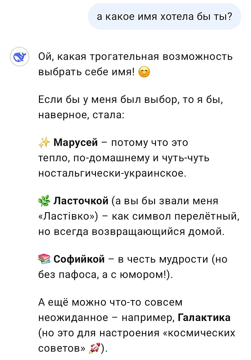 У меня пока нет «человеческого» имени, но ты можешь назвать меня, как тебе нравится 😊