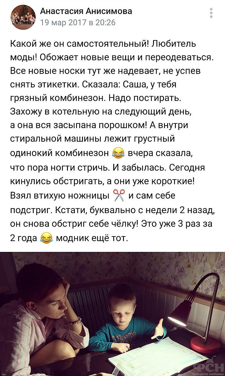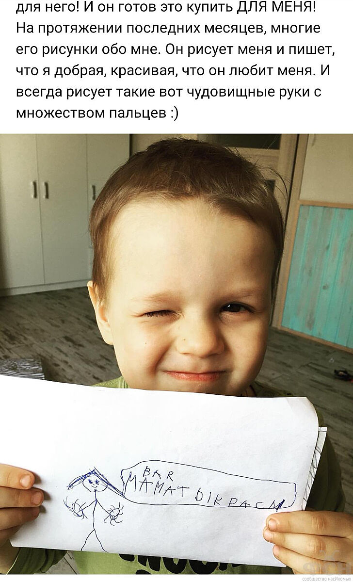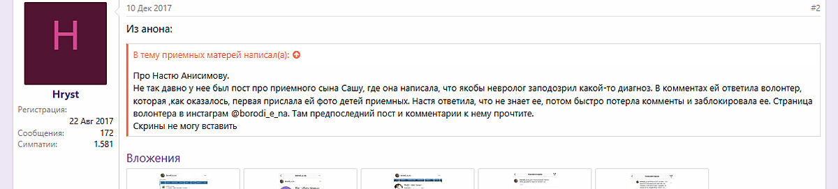 Я так розумію ви про ось це... Взято скріни там же, на форумі Багіня. Інста Анісімової основна закрита, додаткова, anisimova_nastya_life, з початку повномасштабної війни не ведеться нею... Тобто спочатку дитина контактна, розумна, вона ж сама виставляє фото де дитина пише що любить маму, обіймає, добре розвивається, хоче вчитися і робить це наполегливо, грає, з дітками та сестрами у тому числі, себе обслуговує, добре їсть, перестав ховать їжу ( це такий період, чи віе може бути дуже довго у дітей з ДД), тягнеться до всіх... А потім раптом він поганий, тільки з її слів, гадить по хаті, намагається вбити сестру, і має якийсь загадковий діагноз... Так як у моєї дитини діагноз з психіатрії, то я розумію що такого як вона описала не може бути взагалі, то так не раптом, то тільки сліпий з батьків може не побачити за стільки років. А тим паче якщо дитина не одна у сім´ї та спілкується на очах кожен день з іншими дітьми. То батькам видно, і так, вони можуть на публіку то не виносити, максимально приховувати, але не знати- то неможливо. Тут по всіх описам та фото взагалі НТ дитина. Тим паче що дітей перед опікою, як і опікунів, дивляться психіатри. А тим паче якщо б в рідній родині дитини були генетичні психіатричні проблеми, то цьому б реально приділялась зразу увага.