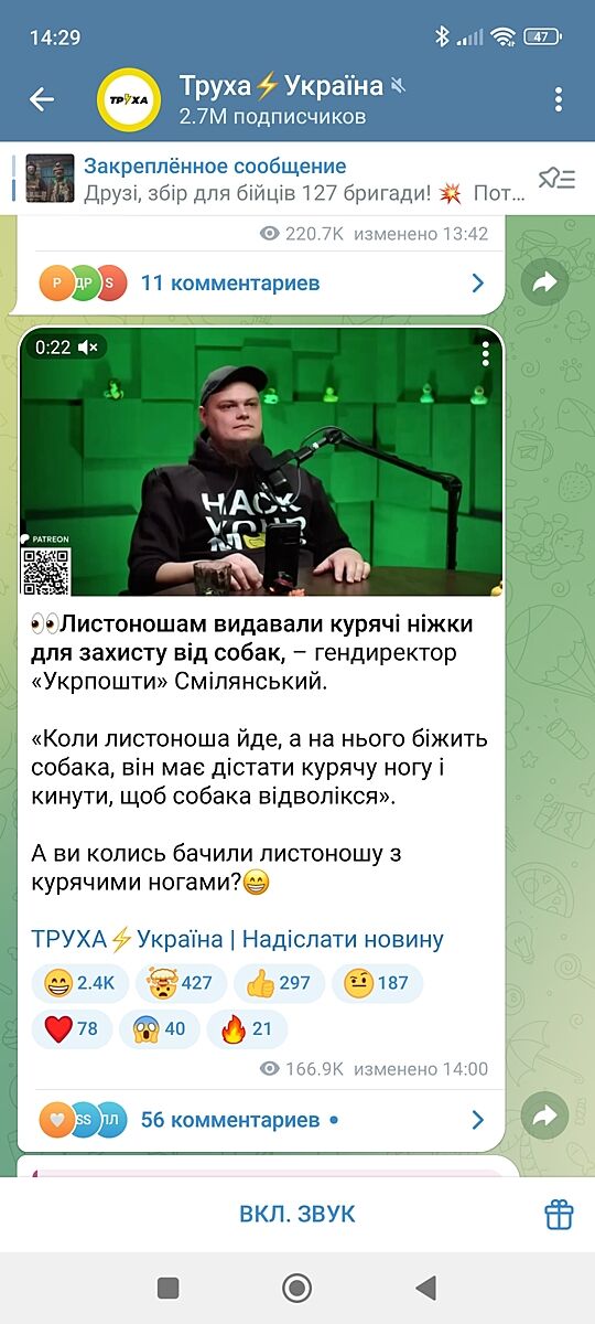 Нашей почтальонше 100 лет в обед. Я с трудом понимаю, как она эту сумку тягает. На отделении остался один оператор, потому что нет дурных работать за три копейки. Почта теперь до 16 ч. А этот хрен ноги куриные вместо шокеров и отпугивателей раздает. Шапито позорное 🤮