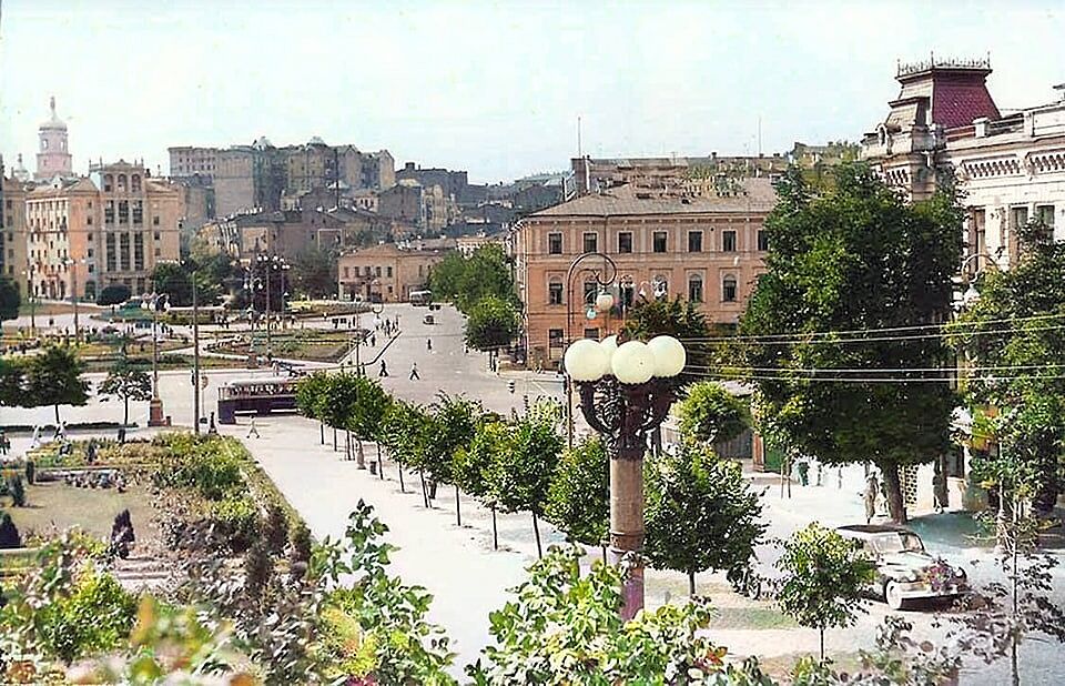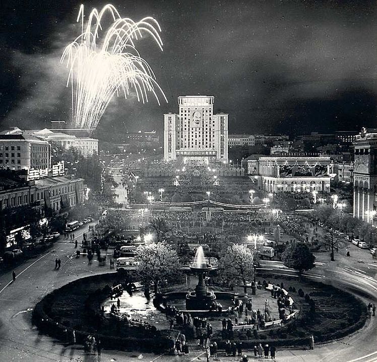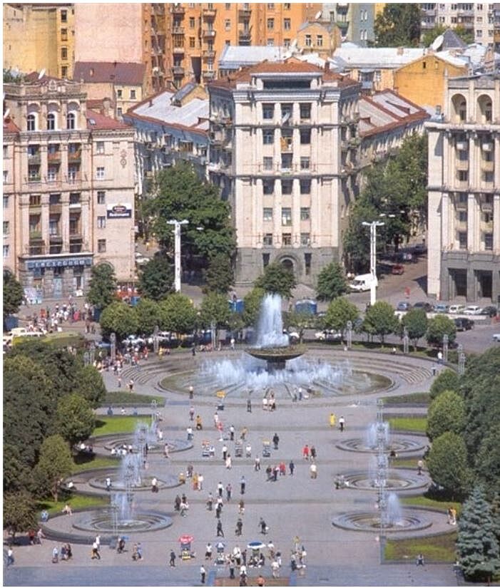 ’От главного фонтана в сторону Крещатика распланировали еще шесть фонтанов меньшего размера в два ряда. Надо сказать, что в таком виде площадь полюбилась киевлянам, возле Рулетки отдыхали в жаркие дни, здесь назначали свидания, сюда приходили десятиклассники после последнего звонка.’