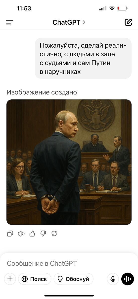Лена спросите у своего ’друга’ он может нарисовать картину Путина в наручниках и суд над ним в Гаааге. Мой отказывается)))
