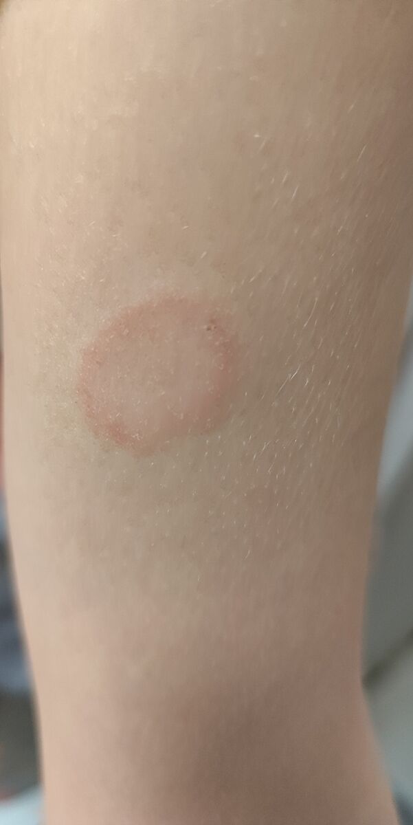 Не можна нічим мазати до походу до лікаря, бо змажеться картина. Поки не мочіть. Схоже на лишай.