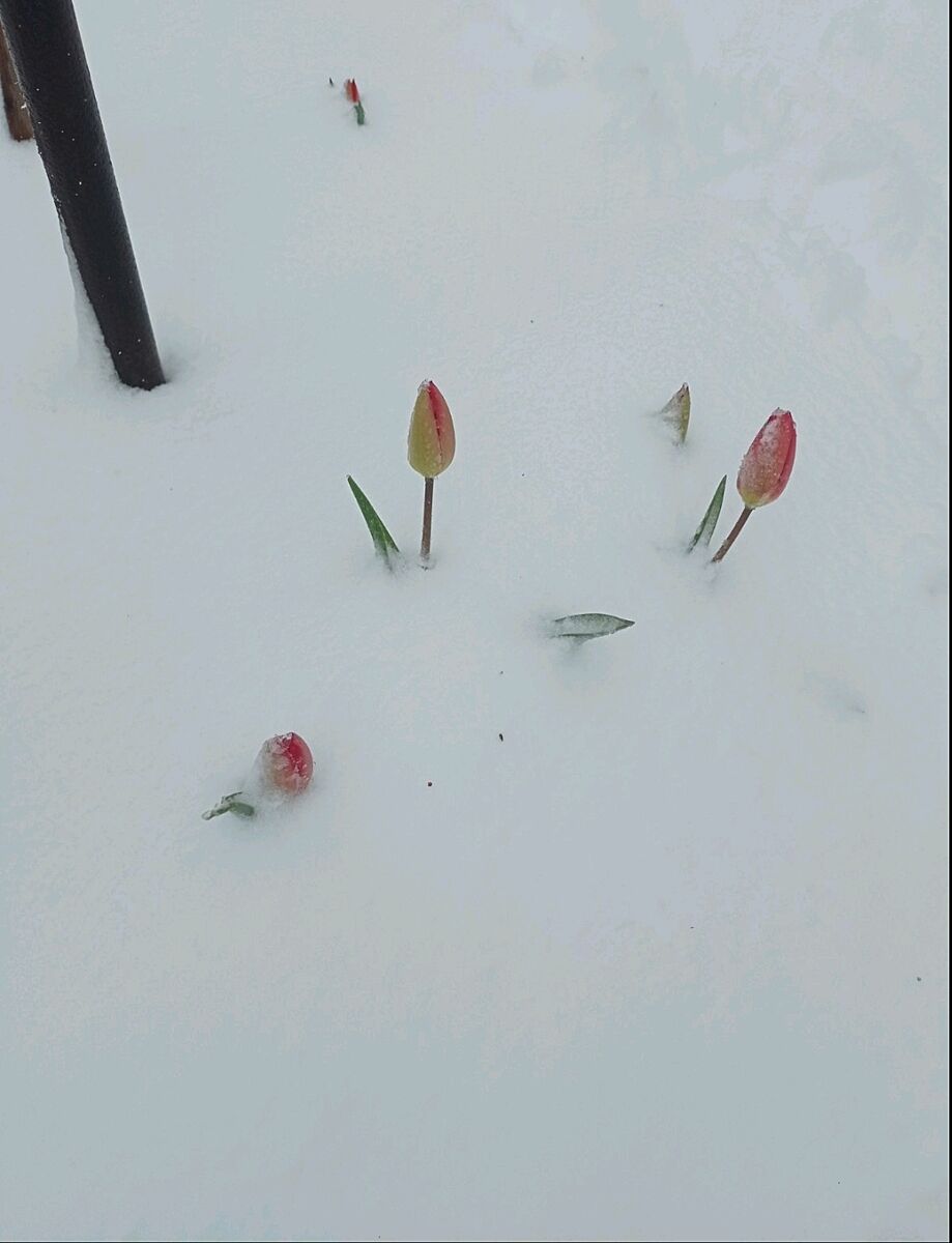 Під вікном клумба з тюльпанами та нарцисами, з під снігу тільки червоні верхівки тюльпанів стирчать, все замело(