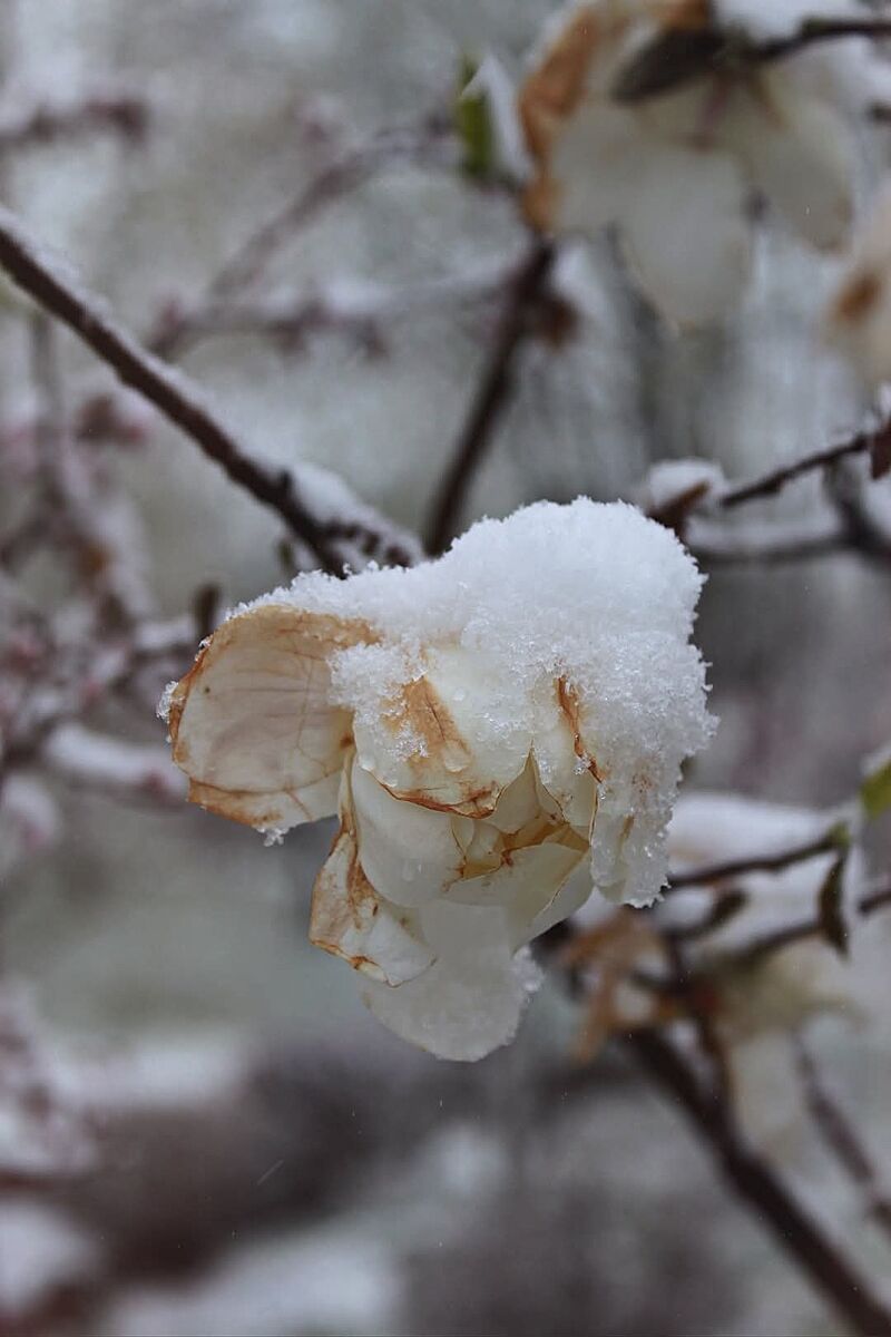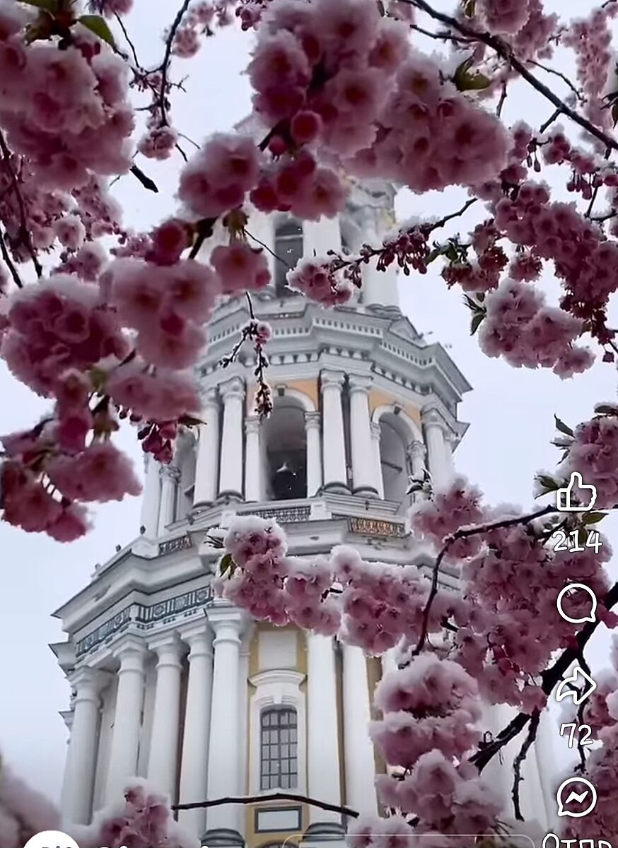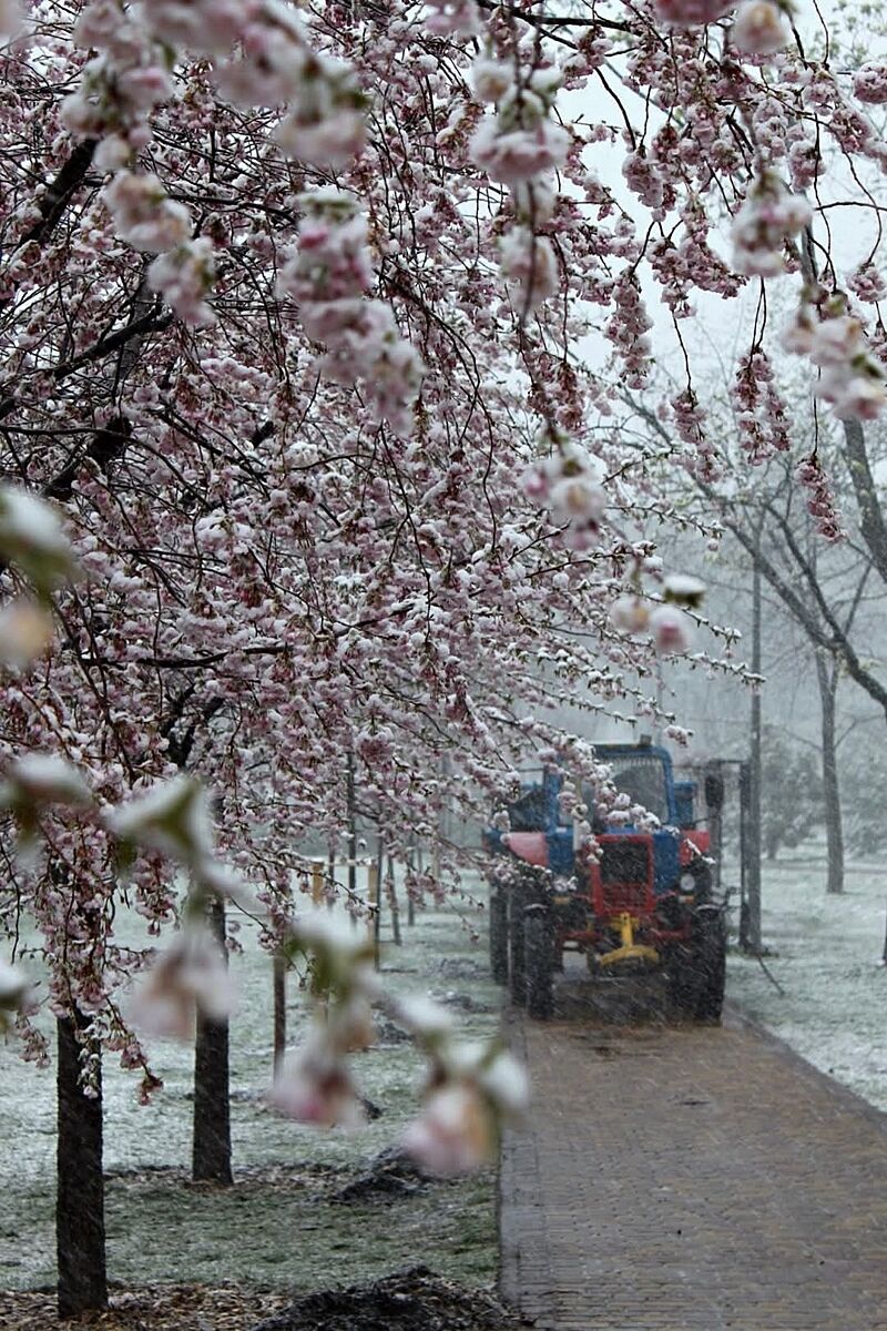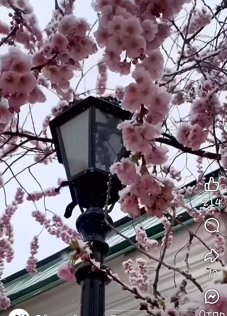 Вчорашнє фото знайомої , на другому вона, звісно в шапці і скручена від холоду, але сакури є. Або вона встигла до снігу