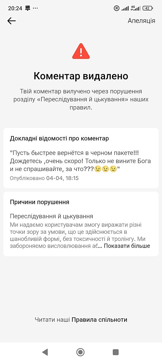 Такі коменти моментально видаляються. Там, мабуть , фільтр якийсь. А коли пишуть про нас, то норм, висять. Мої навіть смайли видаляють. Вчора написала ’ н...’, видалили😆