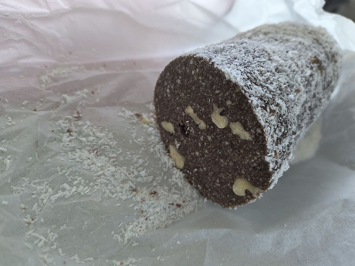 Шоколадная колбаса, гречневой хлеб и мясо запеченое- без фото, лень вставать.