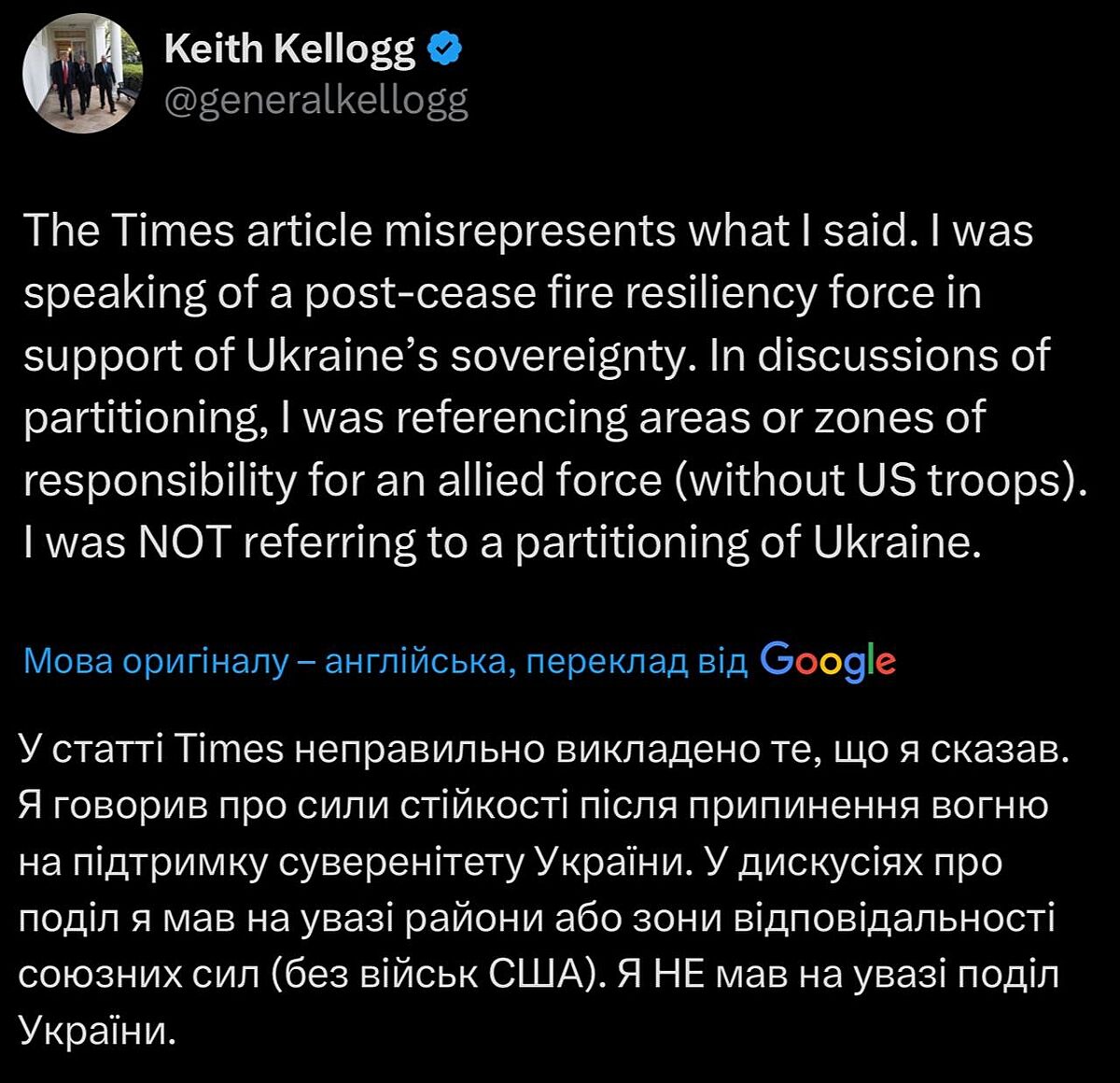 Кіт Келлог запропонував розділити Україну на зони, де і які війська стоятимуть після завершення війни. Він порівняв це з поділом Берліну, який після капітуляції Німеччини у 1945 році поділили на окупаційні зони. Про це пише Times.
