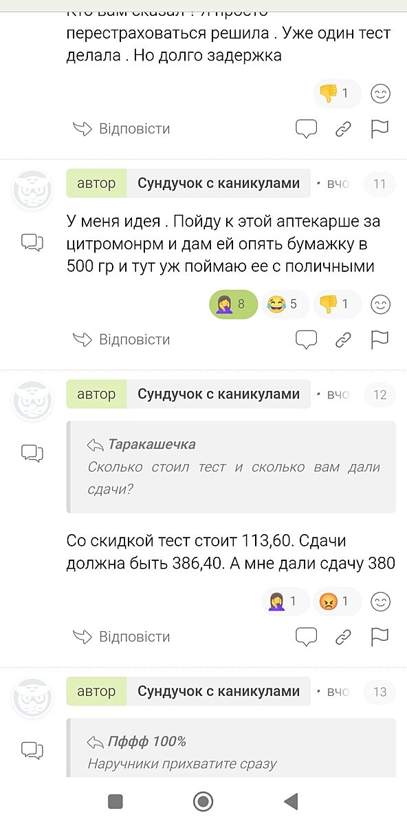В продолжении темы что не додали в наглую сдачу https://sovet.kidstaff.com.ua/question-3703372 когда я вчера покупала тест на беременность . Сегодня заглянула утром в пачку , на пачке написано -2 теста , в пачке оказался один тест , кто то второй тест - спер 🙈🙈У меня просто возмущение зашкаливает , ещё после вчерашнего не отошла и на вот ещё .. второй тест использовала , отрицательный слава богу . Но что бы вы делали на моем месте ? Пошли бы в аптеку разбираться по поводу отсутствия второго теста ? Но получается у меня нет доказательств . Не знаю что делать ,на горячую линию что ли звонить . Что бы вы сделали на моем месте ?Кроме этого аптека ещё удобная в моем доме, если сейчас скандал устрою, то больше туда наверное ходить не буду , но фиг с ним, справедливость дороже (((