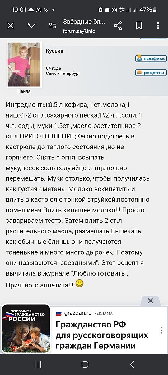 Мне здесь Чаюри давала рецепт блинов на кефире с молоком. Очень вкусные.