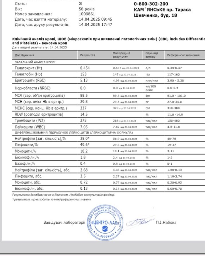 • Картина типична для вирусной инфекции или перенесённого заболевания — нейтрофилы понижены, лимфоциты повышены.