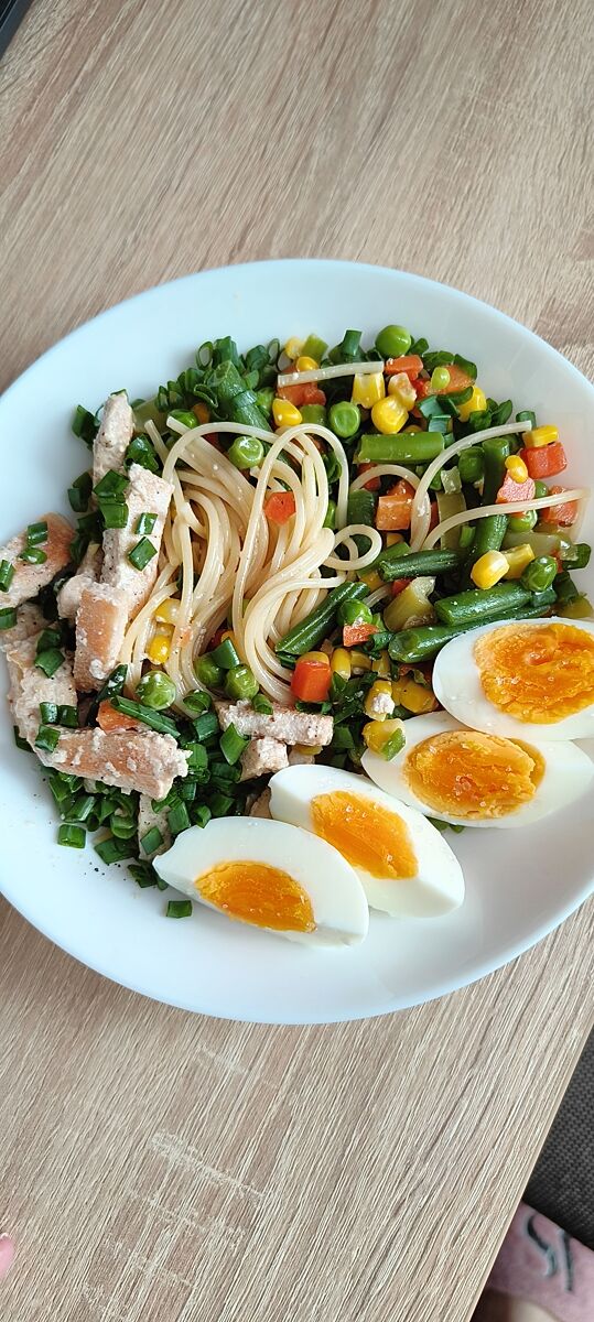 494 ккал. Спагетти с курицей в сливочном соусе.
