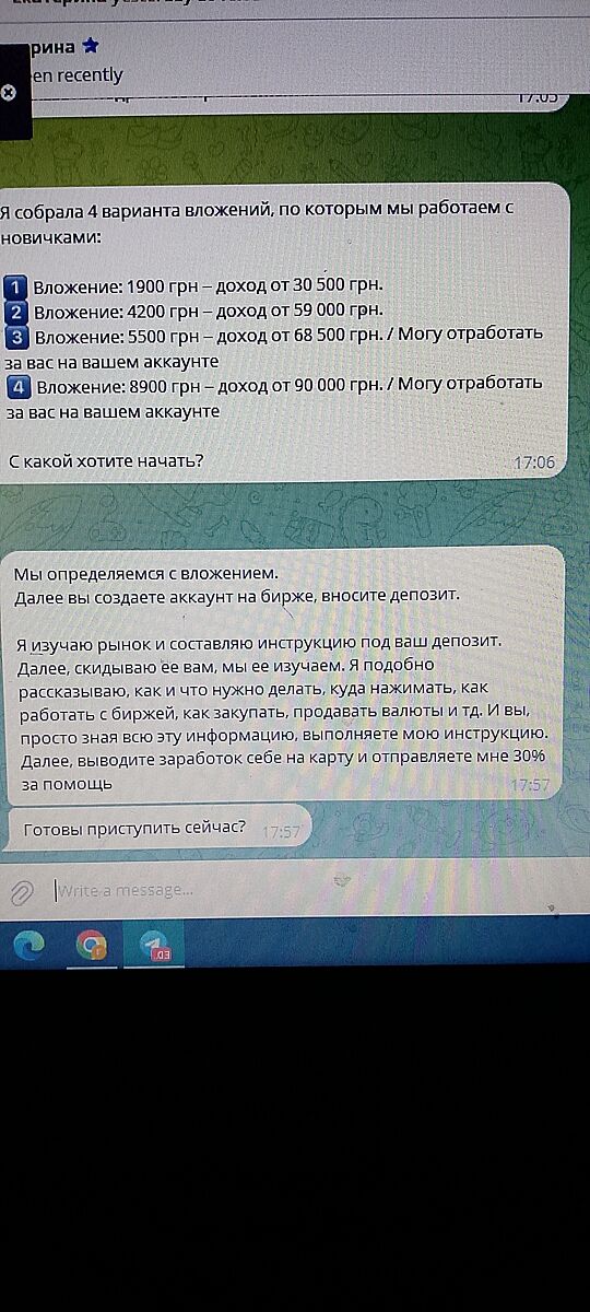 Внимание, в телеграмм приглашают для быстрого заработка, всего 2-3 часа в день, это Ekaterina Invest, это все неправда, не верьте. Обещает быстрые и большие деньги, а нужно сначала отдать свои, кровные, и ничего взамен не получите!