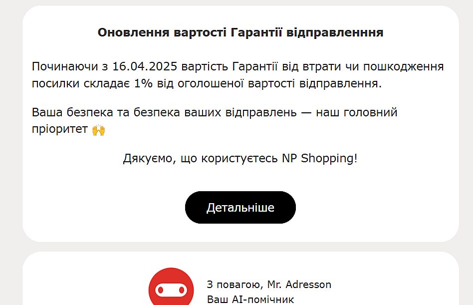 ’Починаючи з 16.04.2025 вартість Гарантії від втрати чи пошкодження посилки складає 1% від оголошеної вартості відправлення’