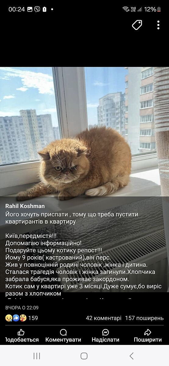 А яка різниця Київ чи ні. Якщо так сталося що робити? Думаю текст написан спеціально жалісно щоб кота забрали. Ніхто устпляти не збирався перса. Знайде родину і буде все добре.